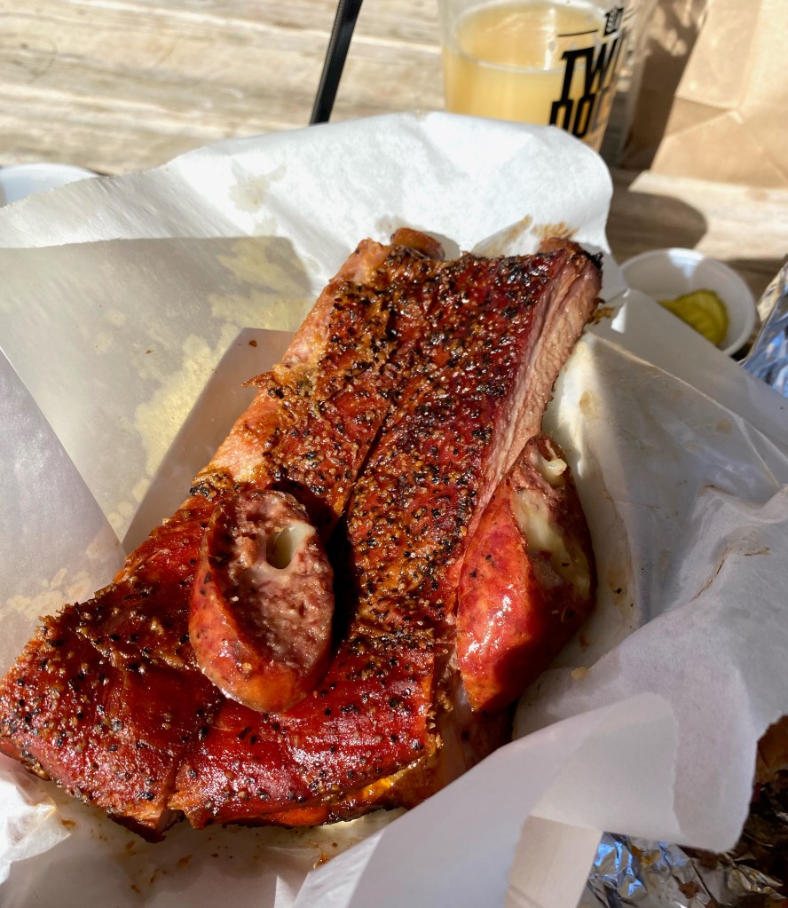 It’s a beef sausage Ian Timmons owner and pit master makes with brisket trimmings in a pork casing. I can’t even remember what kind he said it was and I keep staring at this photo to see if I can remember, but the only memories I have of it are purely visceral and profound ones. The snap of the casing, the tender smokey filling. The creaminess of cheese and the velvety unctuous juices. It reminded me of the first time I had Foie gras or marrow bones. Or when my grandad showed me what 120mph feels like. It was down a back road and I couldn’t peel my 10 year-old head forward from the seat back and my guts were in my throat. Then I cried. Then I laughed. My grandad just grinned. Look, I know it’s just a beef sausage, but I’m telling you as soon as I tried it I knew things; things like 2021 is going to be a much better year, and yes, we’re all going to make it, as humans, as Americans, as democrats and republicans, even. That’s what I remember about the sausage. And I cried, then I laughed, and Ian just just stood there grinning.